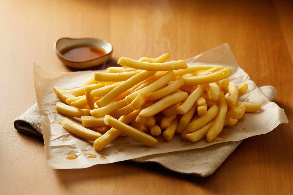 Des frites croustillantes à l'extérieur et fondantes à l'intérieur, relevées d'une touche acidulée de vinaigre blanc. Une recette classique qui demande un peu de patience mais vaut vraiment le coup.