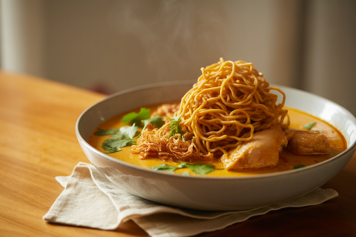 Ce curry thaïlandais aux nouilles et poulet mêle des saveurs intenses — curry, curcuma, lait de coco — avec une touche acidulée de citron. Garni de nouilles croustillantes et d'oignons frits, c'est un plat complet et réconfortant qui change du quotidien.