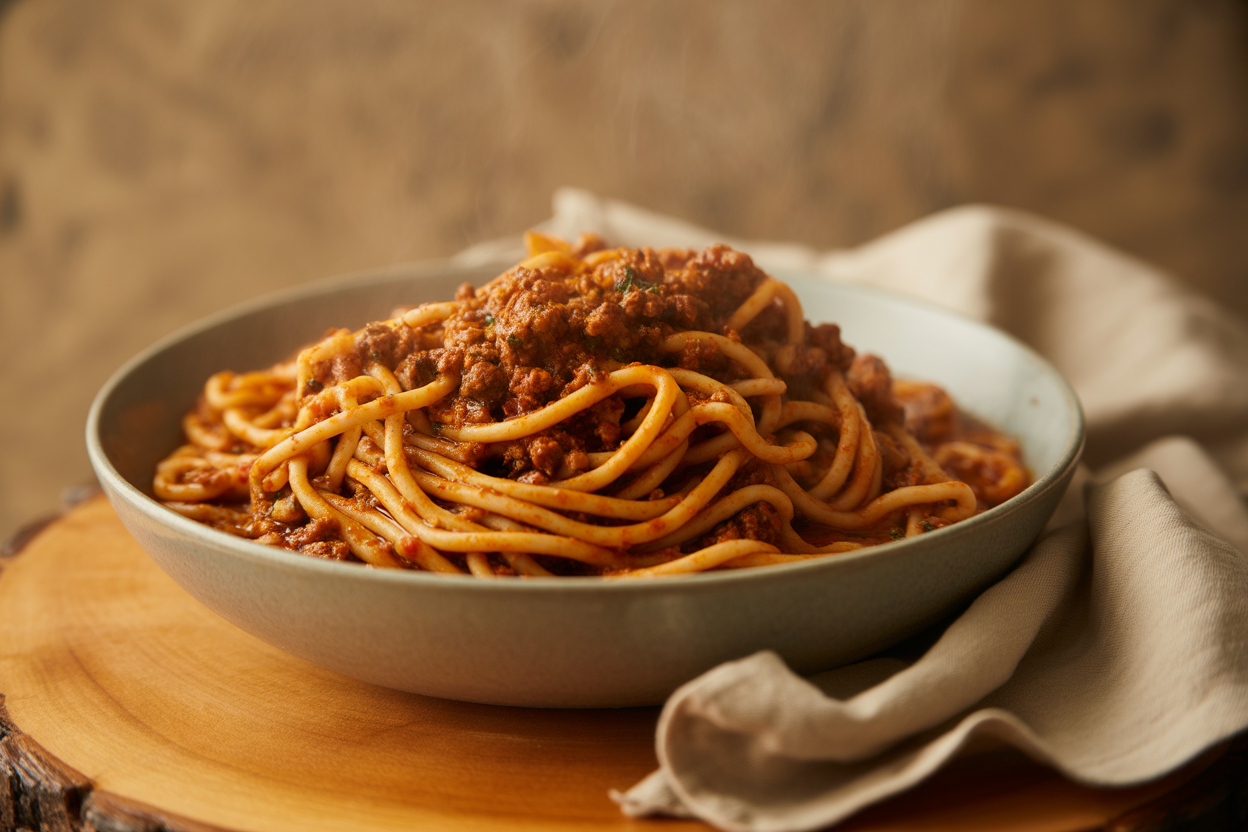 Un plat méditerranéen généreux où les pâtes se marient avec une sauce riche à base de viande et d'épices chaleureuses. Parfait pour un repas convivial en famille.