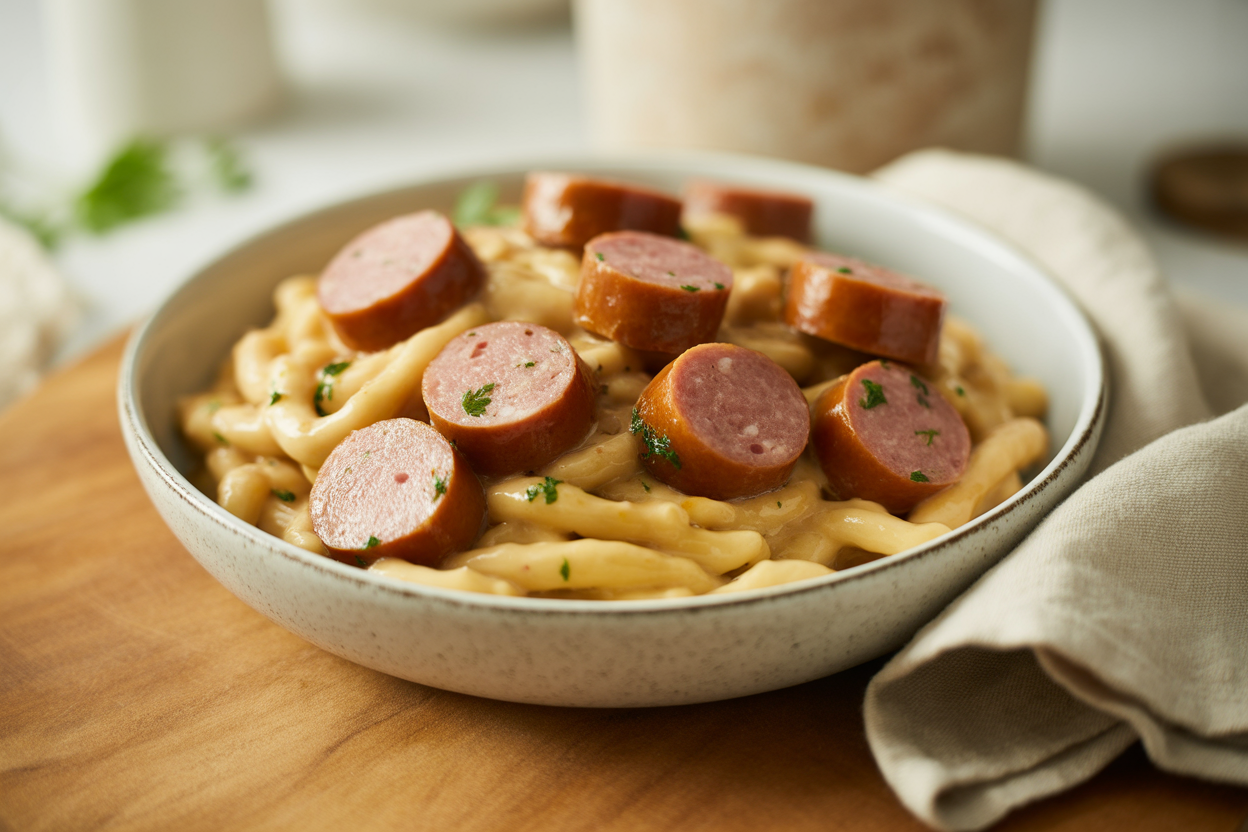 - Ajoutez les saucisses de Toulouse coupées en rondelles et laissez cuire 4 minutes en les retournant à mi-cuisson.