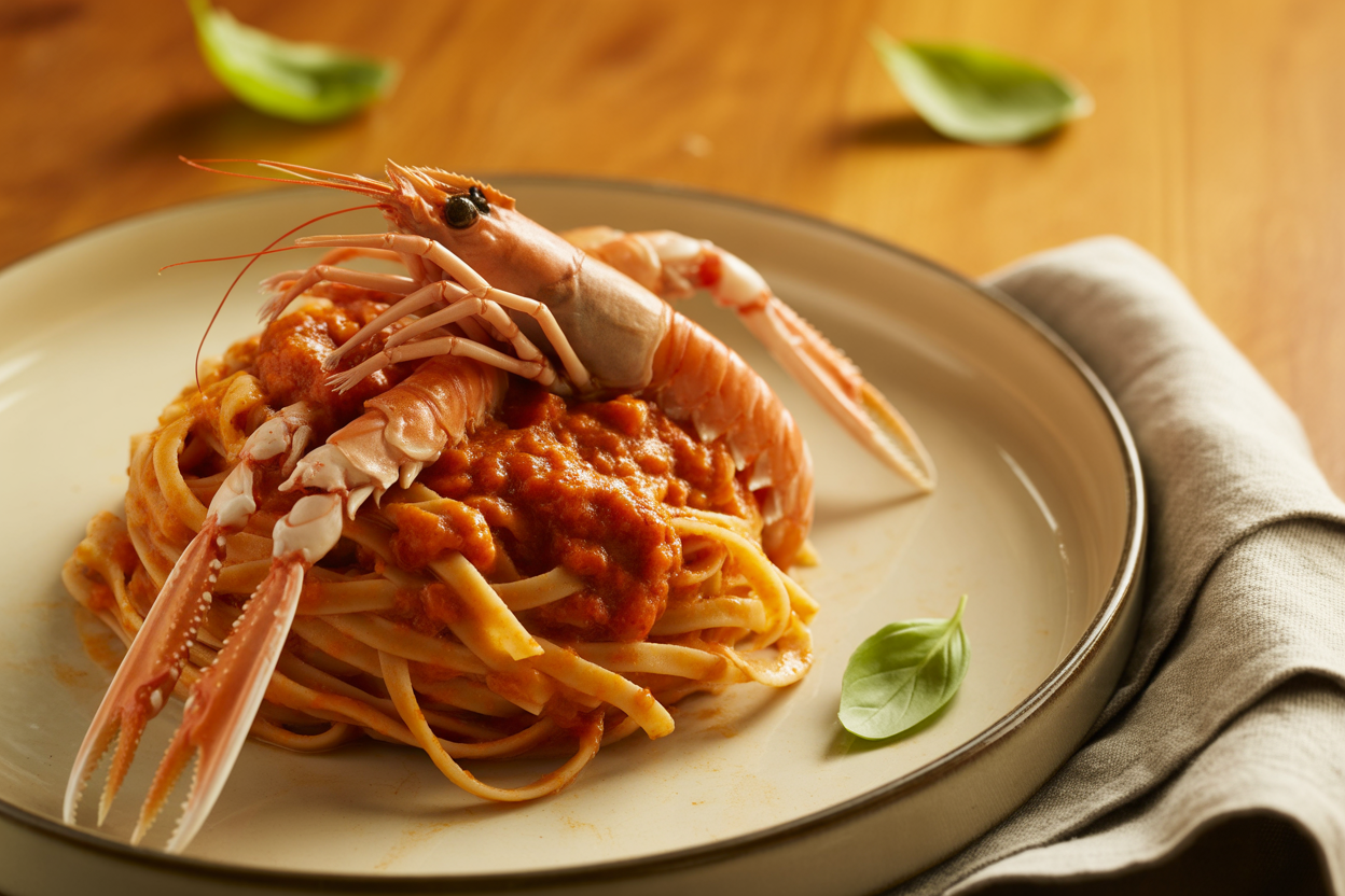 - Égouttez les pâtes et versez la sauce aux langoustes dessus. Servez sans attendre.