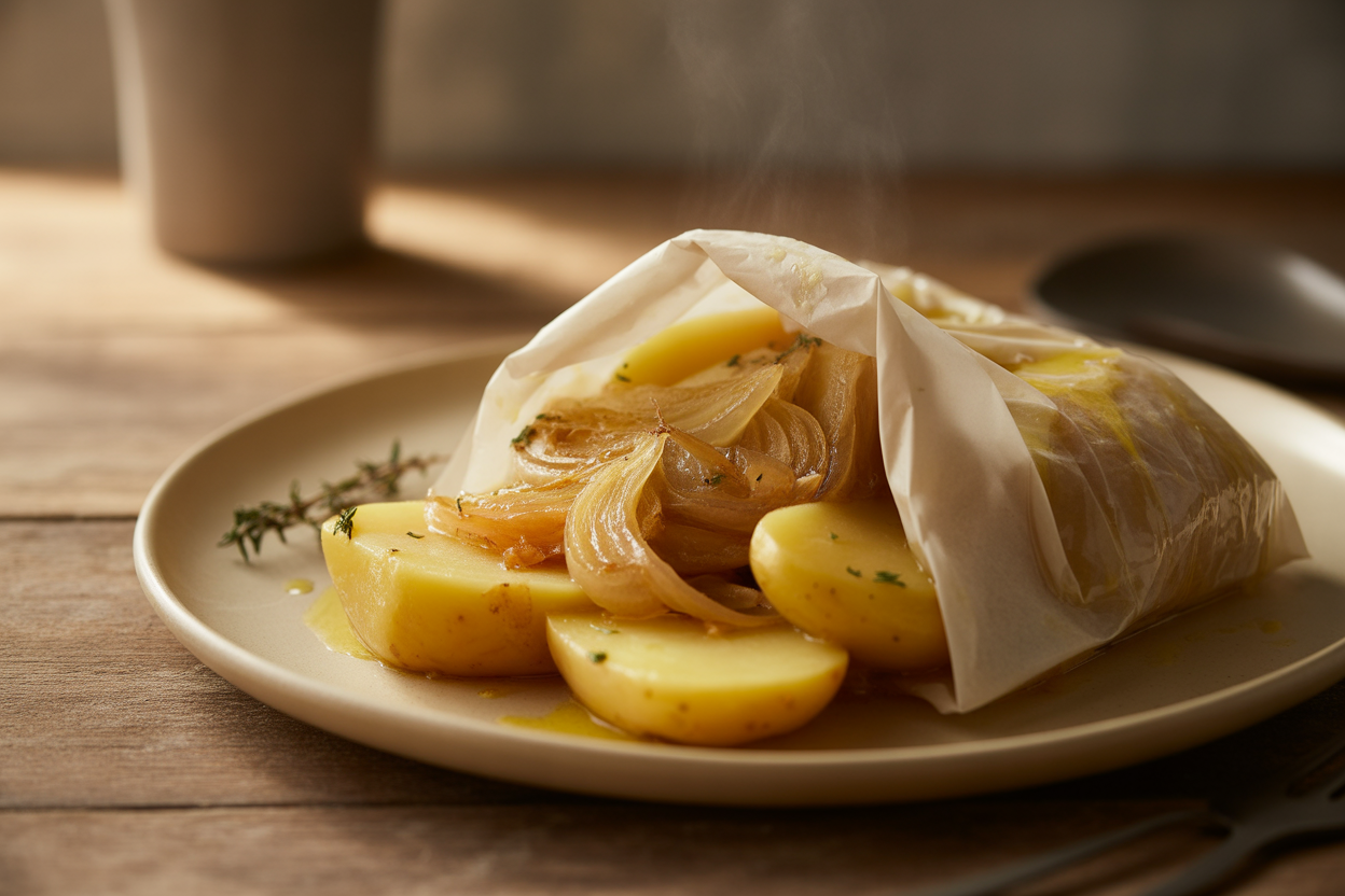 Une recette simple et réconfortante où les pommes de terre et les oignons cuisent en papillote, parfumés au thym et au romarin. À servir avec un trait de crème fraîche pour plus de gourmandise.