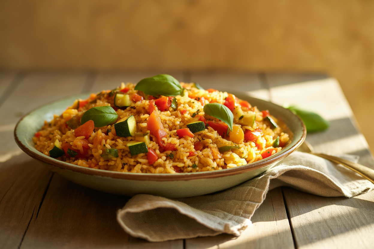 Un riz coloré et parfumé aux poivrons, tomates et olives, qui sent bon le sud. Idéal pour un repas léger et ensoleillé.