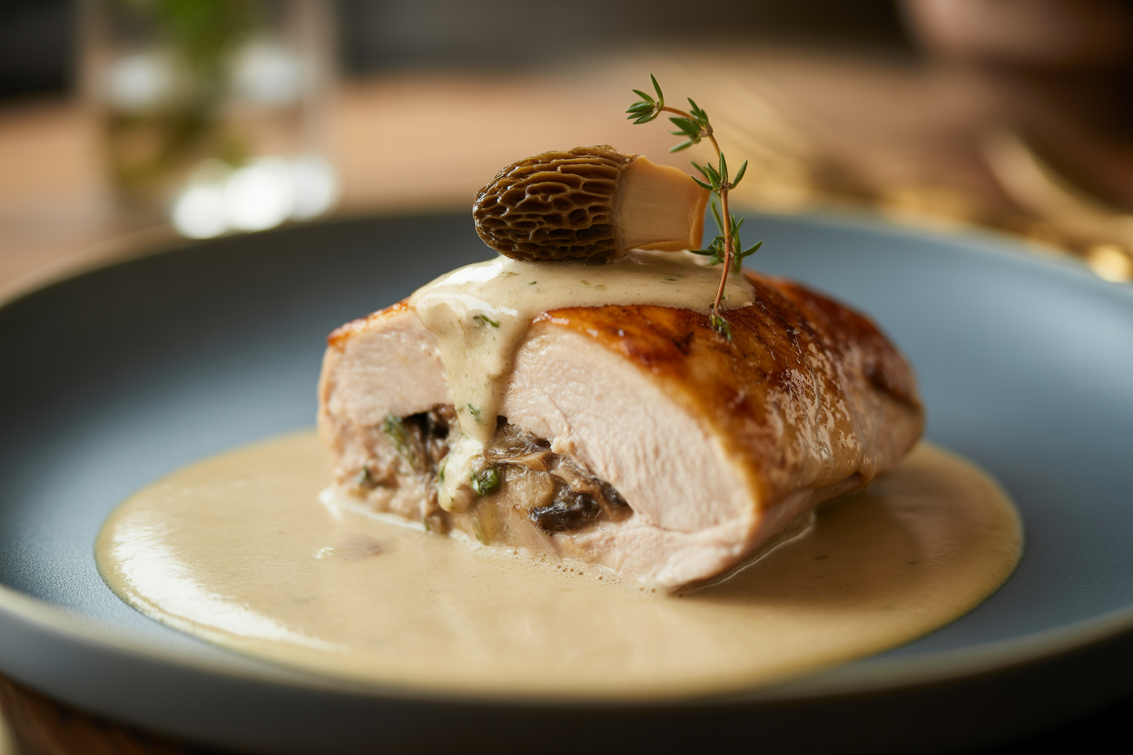 Des filets de volaille farcis à la façon classique, garnis de champignons de Paris et accompagnés d'une belle sauce crémeuse aux morilles et carottes. Un plat élégant qui ravira vos convives du dimanche.