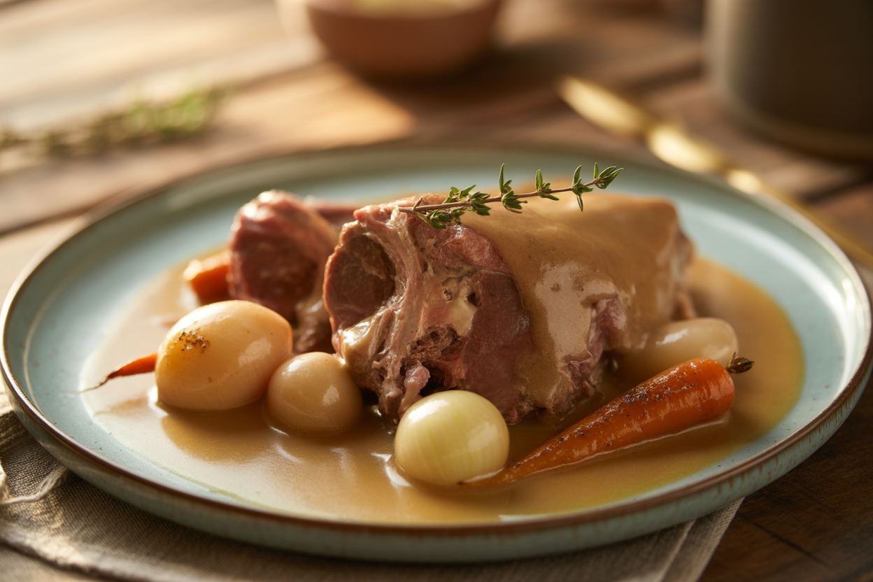 Un classique de la cuisine française revisité à la cocotte-minute : une tête de veau tendre et fondante, accompagnée de légumes de saison. Parfait pour un dimanche en famille.