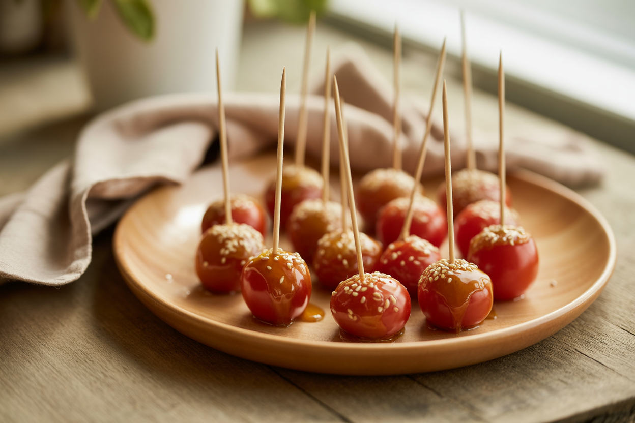 Une petite gourmandise sucrée-salée à croquer d'une bouchée : des tomates cerises enrobées de caramel croustillant et de graines de sésame. Parfait pour épater vos invités lors d'un apéritif ou d'un dessert original.