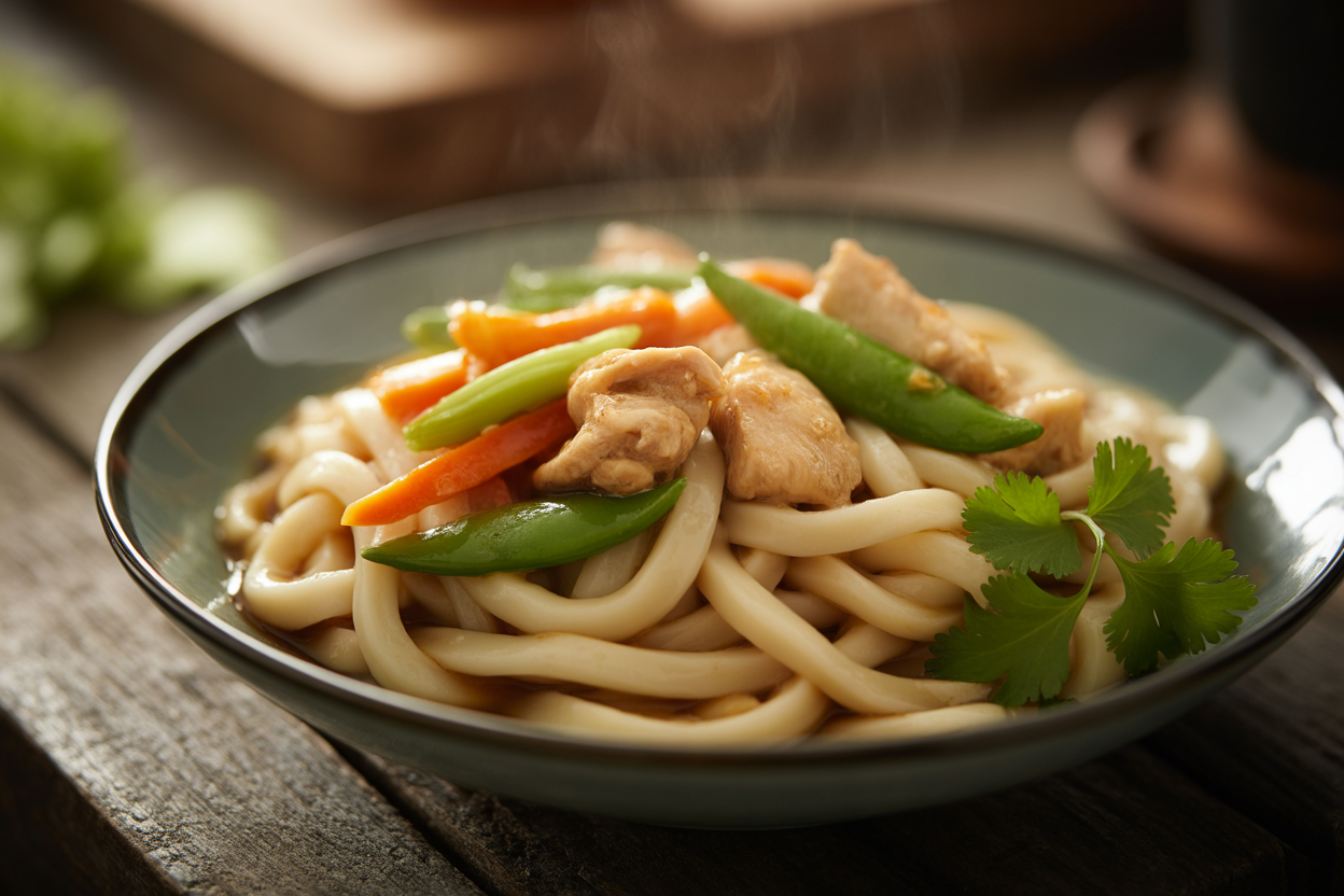 Un plat asiatique savoureux et rapide, parfait pour les soirs de semaine. Les nouilles udon fondantes se marient parfaitement avec le poulet tendre et les légumes croquants, le tout relevé d'une sauce dashi légère.